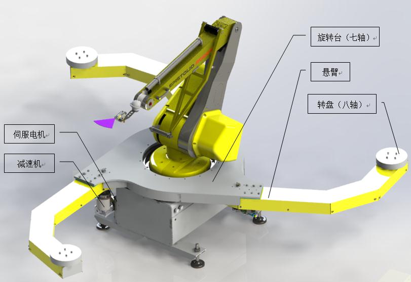 三工位旋转台主要由以下零部件构成:旋转台(七轴)、悬臂、转盘(八轴)、伺服电机、减速机等。